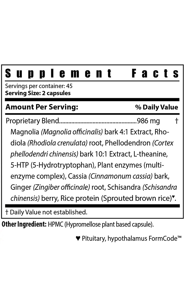 Magnolia Bark Extract & Phellodendron Extract-A unique blend of these two herbs that help the body resist stress caused by biological changes. Also relaxes muscle tension, improves mood, stimulates melatonin, and lessens anxiety.